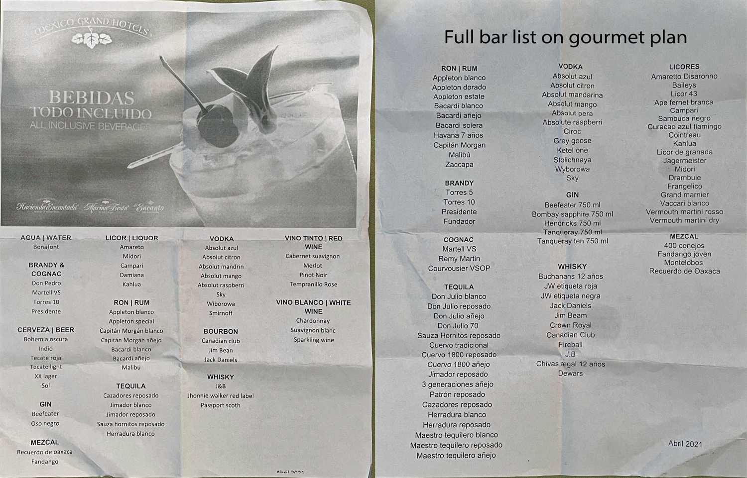 – The hotel is à la carte style all-inclusive. If you are likely to have more than a drink or two while you stay, we very strongly recommend paying to upgrade to the “premium all-inclusive plan”. It provides not only a greater range of “top shelf” spirits, but also offers expanded menu options including steak and lobster tail, plus expanded room service options. That costs an additional $20 per person per day (you have to pay for everyone in your room), and you need to arrange this before traveling by emailing Maritza Venegas at: callcenter@haciendaencantada.com. If you want to upgrade after you get to Cabo, it then costs $30 per person per day.